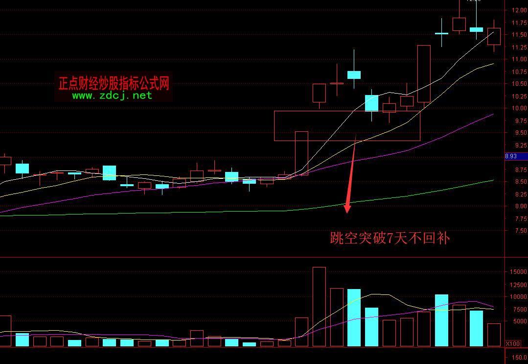 向上跳空缺口5天内未完全回补,受趋势快线获得支撑后大阳突破!股价以开盘向上跳空5个点以上的缺口,一周内不回补可放心买入。