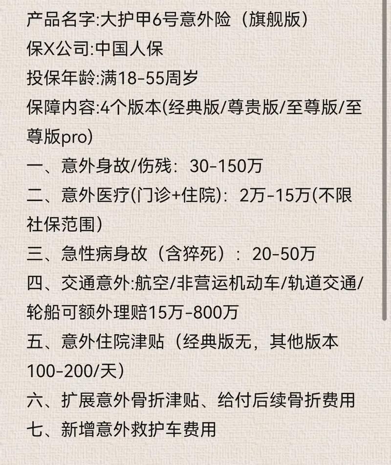 中国人保大护甲6号意外险(旗舰版)以其全面的保障、灵活的投保方案和高性价比,成为了市场上受欢迎的意外险产品之一。无论您是家庭的经济支柱还是普通的上班族,都可以考虑购买这款产品来为自己和家人提供额外的安全保障。