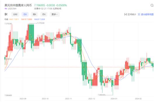 自2023年11月以来,人民币汇率进入升值通道,接连收复7.2、7.1关口,但在2024年初,受市场对美联储降息时点预期变化、国内政策调整等因素影响,人民币汇率波动并在2024年1月最高升至7.086后开始震荡。近期人民币对美元汇率为7.1920,与上年末基本持平。