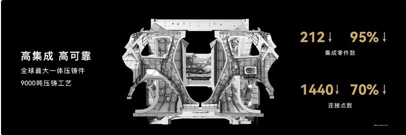 此外,赛力斯智慧工厂还拥有9000T一体压铸机,实现了一体化压铸部件中的高集成度,可以将78件高度集成为1件。实现了平均壁厚3mm以及28%的显著轻量化效果,并将车身开发周期缩短为6个月,真正有效实现高效生产、轻量化、高安全性和降低成本。