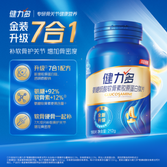 从成分来看,健力多金装氨糖采用7合1配方,将氨糖与硫酸软骨素、骨碎补提取物、胶原蛋白肽、透明质酸、酪蛋白磷酸肽(CPP)、碳酸钙六种成分科学搭配,构建起从“深层修复”到“日常防护”的完整链路。相较于单一成分补充,氨糖作为核心基石,与硫酸软骨素直接针对软骨再生;骨碎补提取物有利于骨形成,草本配方温和易吸收;胶原蛋白肽和透明质酸钠作为双重润滑因子,可以更好润滑关节,减少关节摩擦;而酪蛋白磷酸肽(CPP)和碳酸钙协同,能促进钙吸收,增强骨密度。