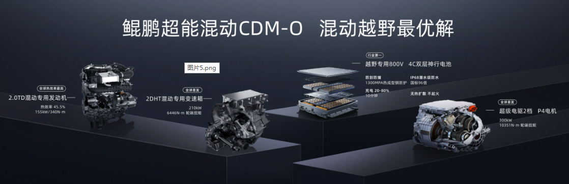 该车型搭载鲲鹏超能混动CDM-O、集成全球最高热效率45.5%的2.0TD混动专用发动机、2DHT混动专用变速箱以及越野专用800V 4C双层神行电池,保障越野动力输出稳定。配备的纵横云台越野底盘、智能全地形模式、非承载式车身+三把差速锁等高能配置,搭配悬架可调MAX 140mm,最大离地间隙320mm,使其能从容应对沙漠、岩石、河滩等各类极端地形挑战,越野能力同级最强。