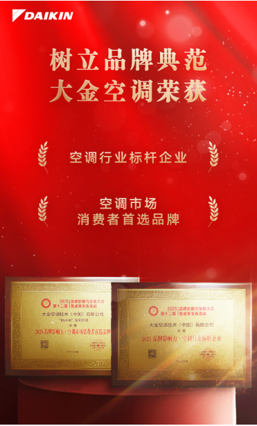 大会提到,品牌是企业综合实力的集中体现,是连接用户与市场的桥梁,更是推动行业发展、服务国家战略的重要载体。在品牌强国战略引领下,深化品牌建设亟需标杆企业发挥示范作用,以广泛影响力引领行业升级。经过“产品品质、服务质量、消费口碑、品牌影响力”四大维度的严格评审,大金作为全球空调行业的领军品牌,在本次大会上被授予“2025品牌影响力·空调行业标杆企业”、"2025品牌影响力·空调市场消费者首选品牌”。这不仅是对其卓越品牌价值的权威认可,更期待以此为契机,与更多企业共同探索品牌建设的前行路径。