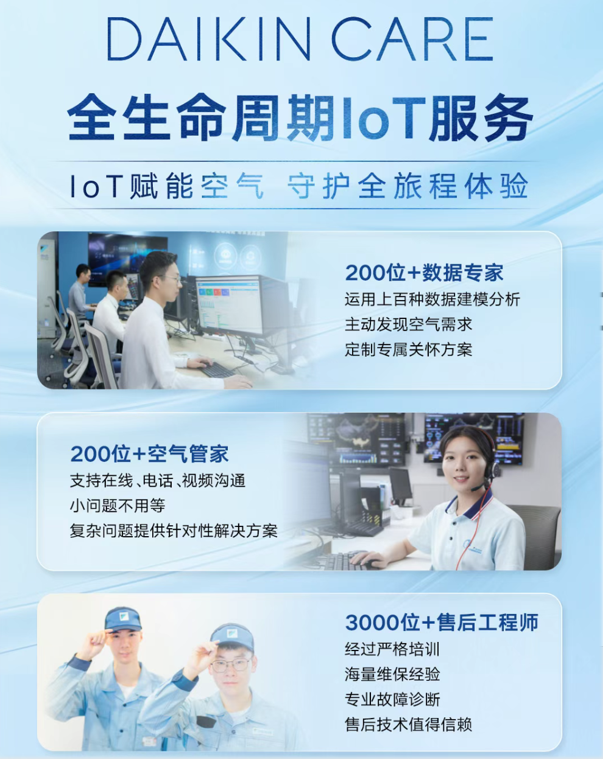 除了产品硬实力,服务软实力在品牌口碑的建立中也不可或缺。大金独有的Daikin Care服务,超越了传统“服务=售后维修”的单一维度,而是构建了以用户全生命周期体验为中心的服务生态体系,包括大金特有的空气专家提案、IoT空气数据分析师在线支持、自有真人客服团队以及售后工程师365天及时响应,为用户提供全流程覆盖的专属空气关怀。在200多位数据专家、200多位空气管家、3000多位售后工程师的共同努力下,Daikin Care全生命周期IoT服务已经持续守护44万家庭,主动关怀225万人次,得到20万用户响应和反馈。