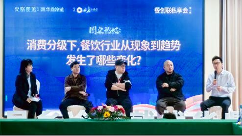 活动现场,华鼎冷链CEO王君、吼堂老火锅联合创始人李小孬、郭铁柱·泥炉老火锅创始人寇鑫、一圣捞火锅总经理裴永祥在大河财立方2024年首期“立方小茶桌”上,围绕餐饮行业新趋势等话题进行探讨。此外,两场分论坛嘉宾围绕2024年餐饮行业潜力品类和爆品预测、供应链如何与品牌联合共创两大话题展开讨论。