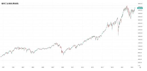 关注道琼工业指数可以发现,从1997年到2023年这段期间,明显可看出虽然在这期间有多次下跌回调情况,但道琼工业指数价格还是持续不断地向上走,这是因为道琼工业指数所追踪的成分股都是具有规模且获利相对稳定的公司,此外,道琼指数会定期审核与调整将不符合资格的成分股删除并纳入其他符合资格的成分,好让产业龙头股可以持续带动道琼工业指数稳定成长。