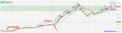 在2021年美国开始降低宽松预期的时候,日元开始贬值,然后在2022年3月美国宣布加息之后,日元贬值加速。这个时候可以看出来美日上涨速度是非常惊人的。