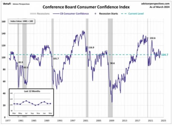 随着时序来到2024年第二季初,市场或是财经专家普遍认为美国经济衰退的时间线将推迟到2025年。CPT Markets分析师指出,所谓的衰退指的是GDP连续两个季度呈负增长,这主要反映的是消费衰退,但读者须注意的是,消费在美国GDP中占比高达70%,因此即使今年科技股的盈利预期较为乐观,却也不意味着消费同样畅旺,举例来说,今年三月,美国经济评议会所公布的消费者信心指数仅为104.7,除了跌至11月以来的最低水平,同时亦低于市场预期的106.9,呈连续第五个月下降。