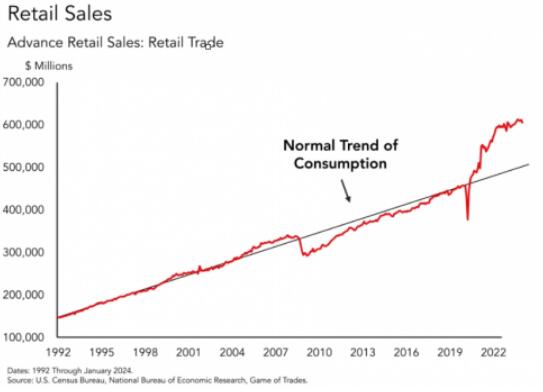 而零售销售数据将能为我们详细说明上述情况,在2020年至2022年期间,零售额实现了大幅增长,超越了长期趋势,主要归因于2020年疫情期间经济衰退后的被压抑需求和追赶性消费。然而,在当前情况下,由于消费者可能在过去几年已经进行了大量购买,这可能导致零售销售回归到长期趋势,值得留意的是,这现象并不是像2008年金融危机那样急剧下滑。