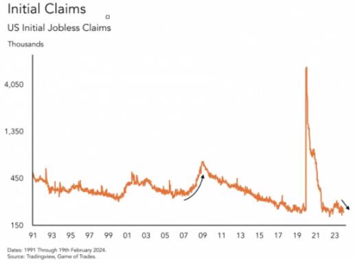 至于就业方面,目前美国近三分之一州的就业率仍低于疫情前的水平,根据美国劳工统计局的家庭数据,16个州中就业人数总共减少了100多万人,这说明全美劳动市场缺工现象且并未因疫情结束(大规模退休和疫情死亡人口)而有所缓解。此外,目前首次申请失业救济人数正呈下降趋势,这表明劳动市场仍属强劲,而若与2008年经济衰退前的情况相比,当时首次申领失业金的人数持续上升,与目前的情况形成了鲜明的对比。