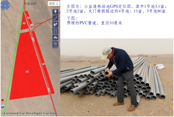 2023年3月30日阳关保护区渥洼池保护站造林现场平面示意图及安装前的PVC输水管材