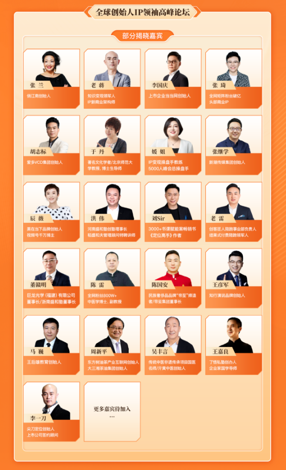 此外,全球创始人IP领袖高峰论坛群星璀璨,精英荟萃,据官方消息透露,新潮传媒集团创始人张继学、俏江南、麻六记创始人张兰、上市企业当当网创始人李国庆、大三湘茶油集团创始人周新平等众多商业巨鳄、行业领袖已确认受邀出席现场进行分享。