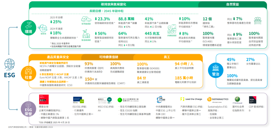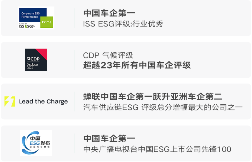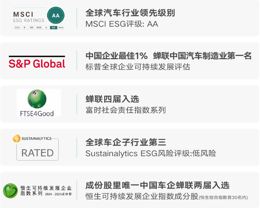 凭借ESG实践与透明披露,吉利汽车2024年获《财经》双碳领导力“卓越”评级,蝉联“中国ESG上市公司先锋100”车企榜首,MSCI ESG评级AA级、恒生可持续发展企业指数等荣誉,巩固其中国车企ESG标杆地位。
