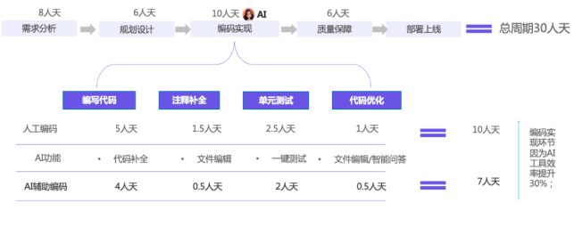 对于最受关注的提效指标,阮航给我们讲了一个项目案例。一个原本30天的项目,通过通义灵码加成,原本耗时10天的“编码实现”环节,编写代码从5人天缩减为4人天,注释补全从1.5人天缩减为0.5人天,单元测试从2.5人天缩减为2人天,代码优化从1人天缩减为0.5人天。编码阶段效率提升30%,带动项目整体提效10%。考虑到吉利汽车是一个相当庞大的组织,众多项目累加可得的收益是相当可观的。