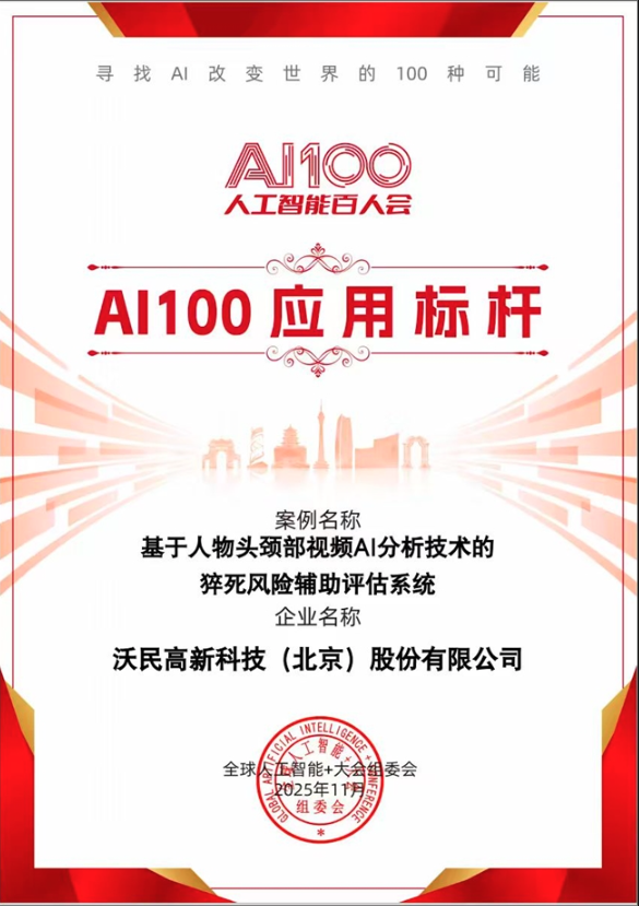 近日,寻找AI改变世界的100种可能——“AI100应用标杆榜” 名单公布,沃民高科报送的“基于人物头颈部视频AI分析技术的猝死风险辅助评估系统”荣登榜单。