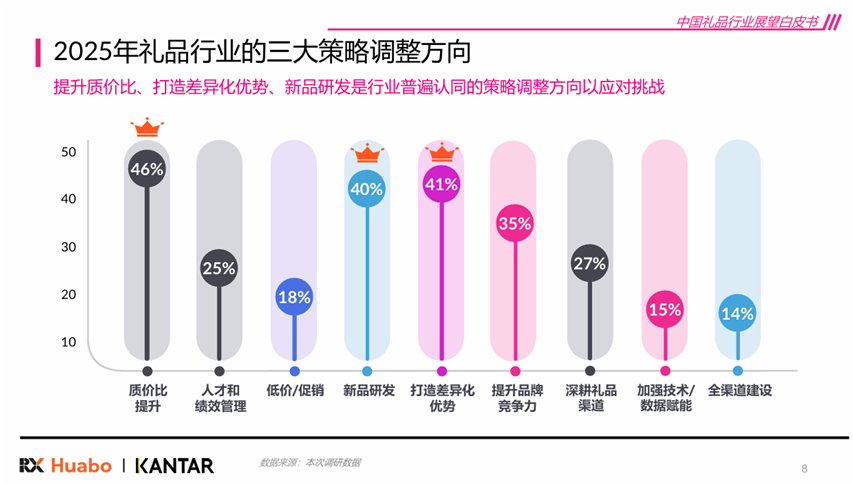 2025年中国礼品行业正处于从规模扩张向“高质量服务深耕”转型的关键阶段。行业信心指数回升至80分,市场结构呈现多元协同特征,民营企业仍是采购主力,采购决策者年轻化趋势显著(90后占比近半),推动需求向个性化、体验化演进。当前行业面临三大挑战:降本增效压力、合规风险上升、情绪价值凸显。企业普遍缩减福利预算,定制化需求增长推高成本,加剧价格竞争与利润挤压。在此背景下,质价比提升成为行业首要调整方向,46%的企业将其列为关键策略,反映竞争焦点从“低价”转向“优质优价”。数字化采购渗透率持续提升,近半企业加大投入,供应链数字化对行业产生积极影响占比达54%,效率革命与价值重构同步推进。