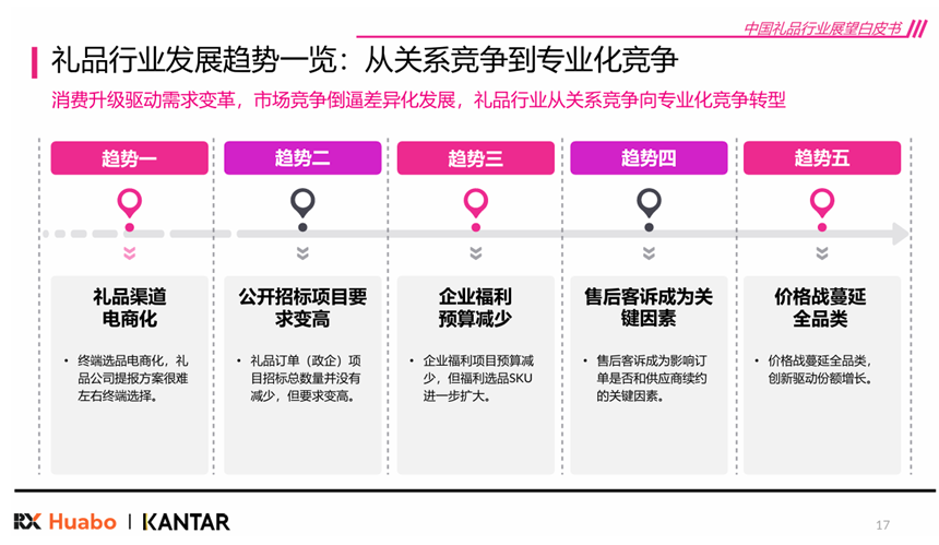 行业竞争正从依赖资源关系向专业化、数字化、服务化转型,具体表现为五大趋势:一是礼品渠道电商化,政策推动与企业采购线上化,价格透明度提高,传统礼品公司影响力减弱;二是政企招标要求提升,强调合规、透明与数字化服务能力;三是福利预算减少但SKU扩大,企业通过扩展品类、弹性福利与积分制提升员工体验;四是售后客诉成为续约关键,物流、定制、响应速度等服务能力直接影响合作稳定性;五是价格战蔓延全品类,标品利润持续走低,唯有通过差异化创新驱动增长,如IP融合、场景化设计、情绪营销等模式,实现产品高溢价与快迭代。整体来看,行业进入“服务决胜+创新驱动”的新阶段。