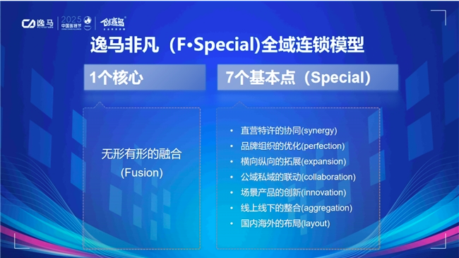结合长期实战研究,马瑞光博士系统分享了逸马自主构建的 “逸马非凡(F·Special)全域连锁模型”,该模型围绕“多模式协同、品牌组织优化、公私域联动、线上线下一体化”等关键模块展开,形成一套支持连锁品牌稳定复制、持续进化的战略操作体系。模型核心强调:在AI逻辑主导的新阶段,企业增长的确定性将来源于系统的精细度与组织的协同性。