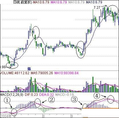图中的①②③④处都是对应的买卖点,这是MACD金叉死叉买卖点的典型教材案例,MACD最简单的用法:高位死叉卖出,低位金叉买入。如果同时配合飞刀的10日均线理论使用效果更佳.