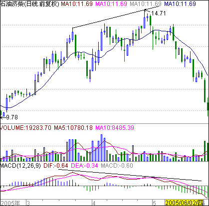 股价与MACD指标趋势背离,则小心!图中该股2005年3月23日至2005年4月29日的K线走势图上就是:股价呈上升趋势,但MACD却成下降趋势(MACD趋势用高或低点连线),这就是macd指标使用技巧顶背离买卖股票.