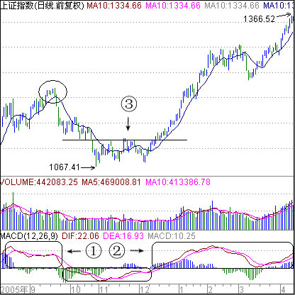 图中①处,MACD指标中的两天线粘合纠缠在一起,此时大盘已经有一定的涨幅,根据飞刀总结的MACD简单买卖法则,MACD死叉后欲金叉不能金叉则会引发一波下跌,在两天线粘合之时应该选择先退出来观望,以保证资金的安全。图中②处,MACD的两条线在轴线之上为持股区域,在轴线之下为空仓观望休息区域。图中③处,股价突破颈线压力,则是跟进买入时机!