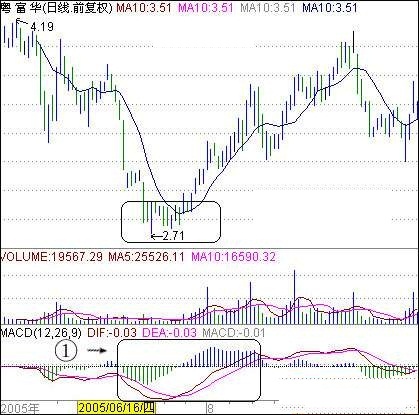 这个MACD“红绿柱法则”只是单方面的提示买卖信号而已,并不能单纯就拿它来作为股票买卖的操作依据。但是其也有其精妙之处,那就需要大家在实战的过程中慢慢领会了!注意结合其他买卖信号同时使用才能真正发挥MACD“红绿柱法则”的独特魅力! 图中①处,绿色柱和红色柱的长短对比,长度是代表某方力量的大小,比如绿色柱逐渐放长,表示空方力量逐渐在增大;红色柱子逐渐放长,表示多方力量在逐渐增大。配合飞刀10日均线理论,股价在超跌之后,上穿突破10日均线的压力,并且10日均线走平,此时就可以考虑短线抄底买进了!