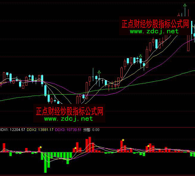 预警:DDX>0 AND MA(V,5)>MA(MA(V,5),5) AND CROSS(DDX1,DDX2),LINETHICK;