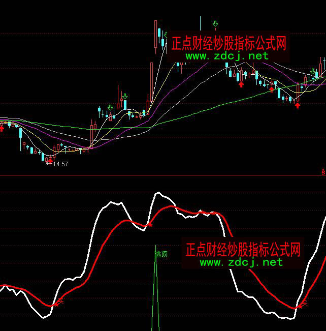 DRAWTEXT(CROSS(趋势线, 长趋势) AND REF(长趋势,1)>80, REF(长趋势,3), '顶'),COLORRED,LINETHICK5;