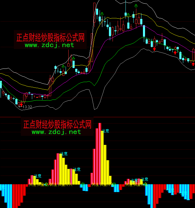 DRAWTEXT(CROSS(REF(净流,1),净流),净流-0,'注意'),COLORFFFF00;