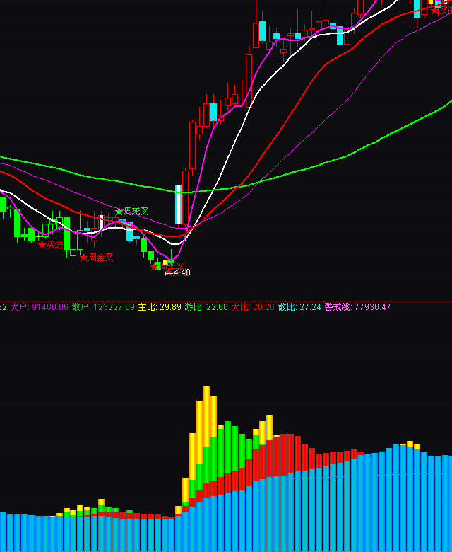 通达信资金主力游资大户散户主比游比散比指标公式实例图解: