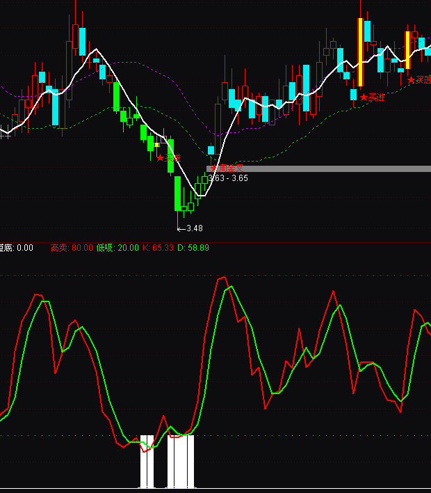 D: EMA(0.667*REF(K,1)+0.333*K,2),COLORGREEN,LINETHICK2;