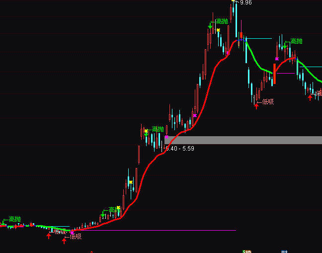 DRAWTEXT(CROSS(庄家,散户) AND 散户>70,H+0.05,'←高抛'),COLORGREEN;