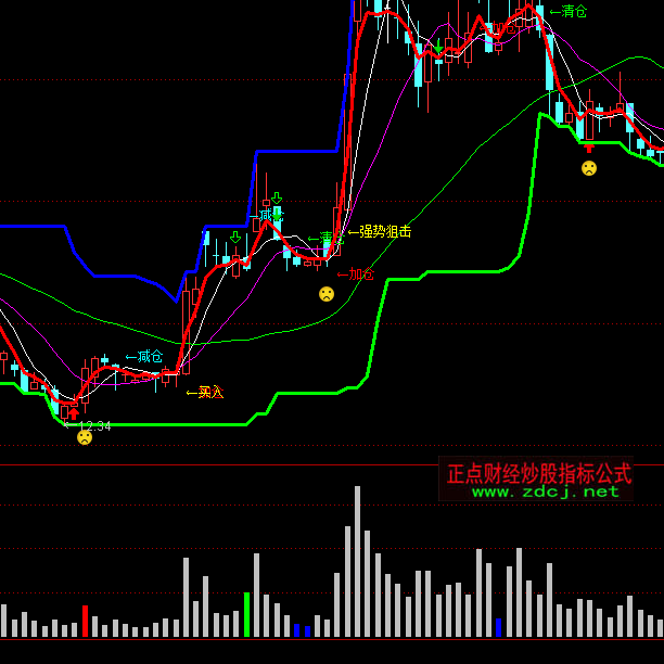 STICKLINE(VOL>MA(VOL,5)*2 AND V>V34*3 AND C<REF(C,1)*1.05 AND CROSS(C,C6) AND V>V5*1.2 AND V>V12*1.2 AND ZZ>2 AND C>H*0.975,VOL*0.5,0,1,0),COLORRED;