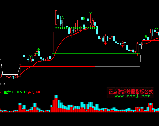 主卖:IF(CLOSE>OPEN,VAR1*((HIGH-CLOSE)+(OPEN-LOW)),IF(CLOSE<OPEN,VAR1*(HIGH-LOW),VOL/2)),COLOR00FF00,POINTDOT;