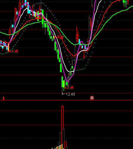 动态底部:EMA(IF(L<= LLV(L,30),SMA(ABS(L-REF(L,1)),30,1)/SMA(MAX(L-REF(L,1),0),30,1),0),3)*10,STICK,COLORYELLOW,LINETHICK2;