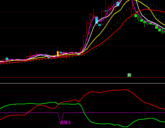 鸡雀升天:IF(CROSS(庄筹线,散筹线) AND CC=1 AND DD>=5 ,10,30),COLORMAGENTA;