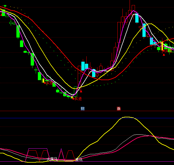 大势已去:IF(CROSS(黑马线,A1)AND 黑马线>70 AND 趋势线>80,90,100),COLORFF0000;