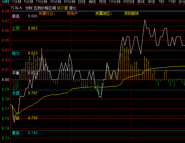 通达信五档价格区间线分时主图指标公式实例图解:
