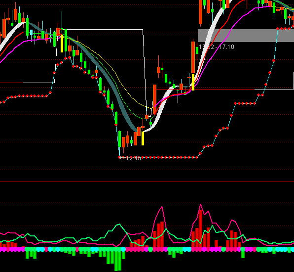 多头撤退:IF(DL>0 AND DL<EMA(DL,3),0,DRAWNULL),COLORMAGENTA,CIRCLEDOT,LINETHICK5;