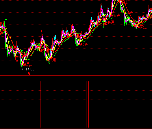 三线粘合:IF(ABS((MA5-MA10)/MA5)<N AND ABS((MA30-MA10)/MA10)<N AND MA5>REF(MA5,1) AND MA10>REF(MA10,1) AND MA30>REF(MA30,5),1,0),STICK,COLORRED;