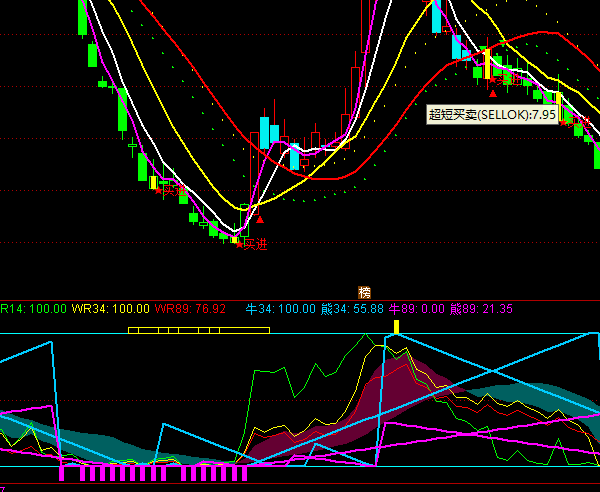 OR (长期线<8 AND 中期线<7 AND 短期线<15 AND 短期线>REF(短期线,1)) OR (长期线<10 AND 中期线<7 AND 短期线<1);