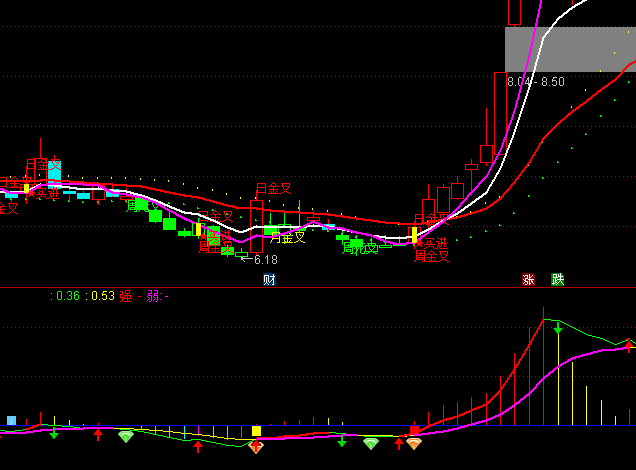 弱:IF(DEA>MA(DEA,2),DEA,DRAWNULL),COLORMAGENTA,LINETHICK2;
