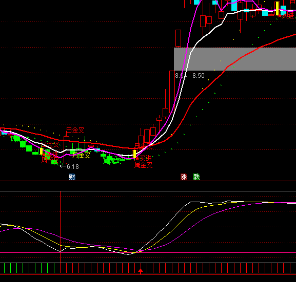 堪称一绝:IF(REF(TJ,1)=0 AND TJ>=1,80,10),STICK,COLORRED;