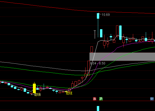 DRAWTEXT((CROSS(SK,SD) AND SK<-0.04 AND (C-REF(C,1))/REF(C,1)>=0.03) OR (CROSS(SK,SD) AND SK<=-0.14 ) OR (CROSS(SK,SD) AND SK<=0.05 AND (V/MA(V,5)>2 OR C/REF(C,1)>0.035)) ,L*0.99,'短线'),COLORYELLOW;