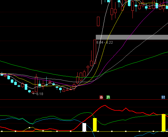 捉鳖:EMA(IF(L<= LLV(L,99),SMA(ABS(L-REF(L,1)),99,1)/SMA(MAX(L-REF(L,1),0),99,1),0)*5,3),COLORYELLOW;