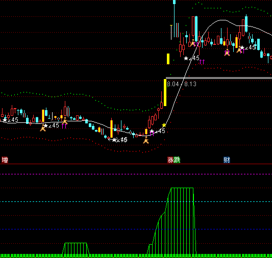 获利不抛:(B0>=B1 AND B0>REF(B0,1) AND B3>=REF(B3,1))*B2,COLORRED,STICK;
