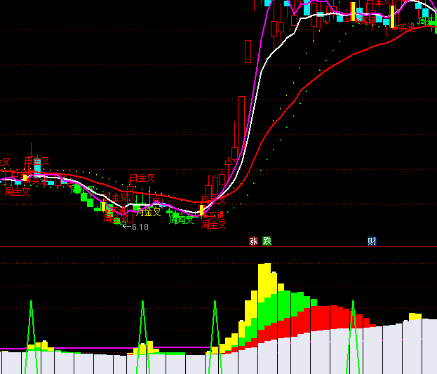 博弈资金出击:IF(CROSS(主力,关注线) ,5,0), COLOR00FF00,LINETHICK2;
