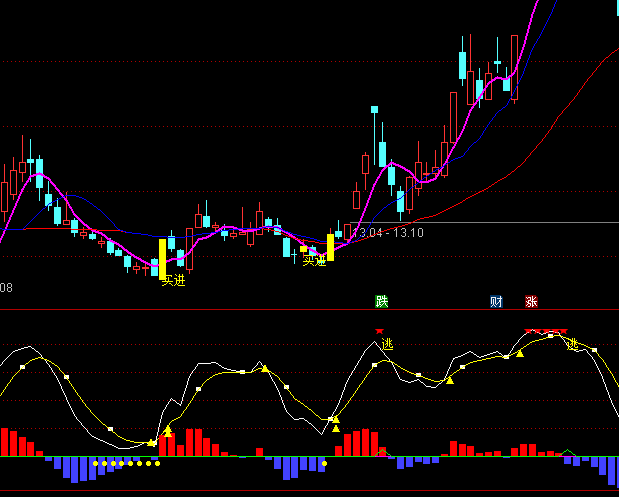 DRAWTEXT(CROSS(K,D)AND VOL>REF(VOL,1)*1.5 AND MA(C,50)>REF(MA(C,50),1),0,'▲'),COLORYELLOW;