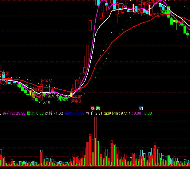 卖盘:IF(CLOSE>OPEN,VAR1*((HIGH-CLOSE)+(OPEN-LOW)),IF(CLOSE<OPEN,VAR1*(HIGH-LOW),VOL/2)),COLOR00FF00,POINTDOT;