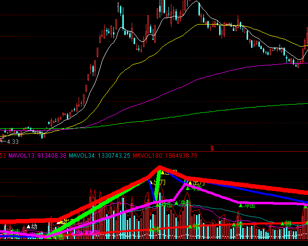 DRAWTEXT(CROSS (EMA(C,7)*(EMA(C,7)),(HHV(HIGH,60)*0.98*(EMA(C,55)))) ,MAVOL1*1.2,'▲动'),COLORWHITE;